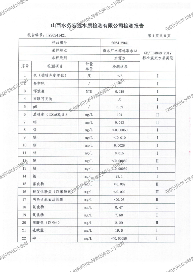 忻州城區(qū)公共供水水源水、出廠水、管網水、管網末梢水2024年12月份水質信息公示
