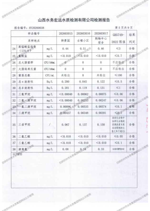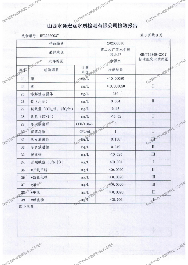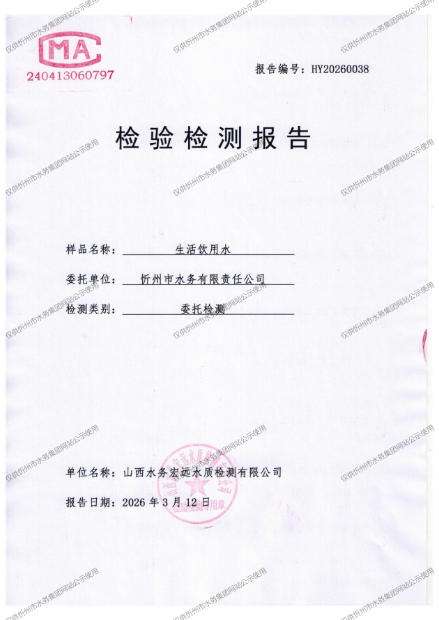 忻州城區(qū)公共供水水源水、出廠水、管網(wǎng)水、管網(wǎng)末梢水2026年3月份水質(zhì)信息公示
