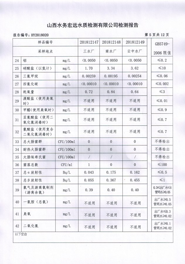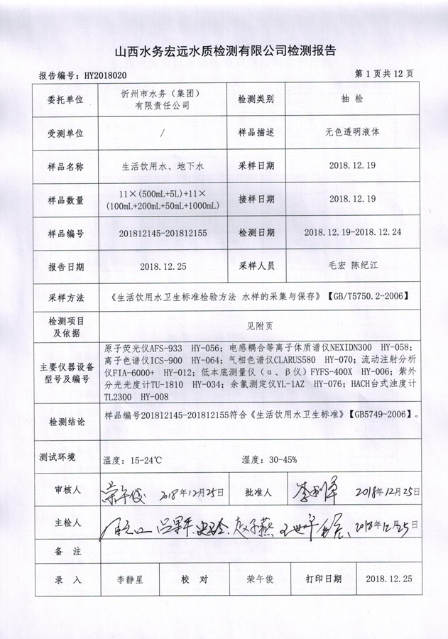 忻州城區(qū)公共供水水源水、出廠水、管網(wǎng)水、管網(wǎng)末梢水2018年12月份水質(zhì)信息公示