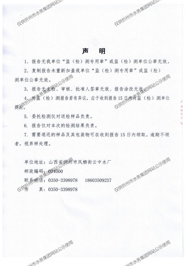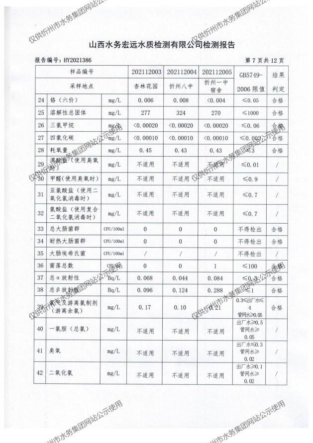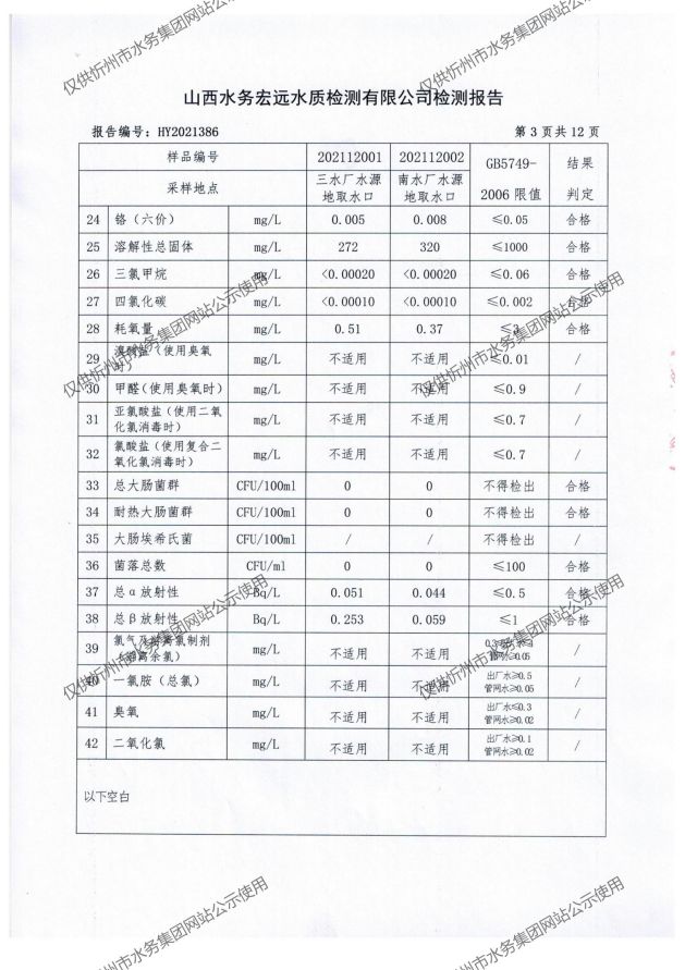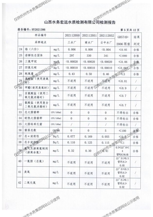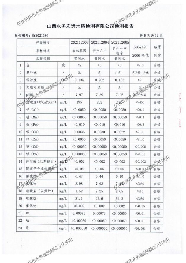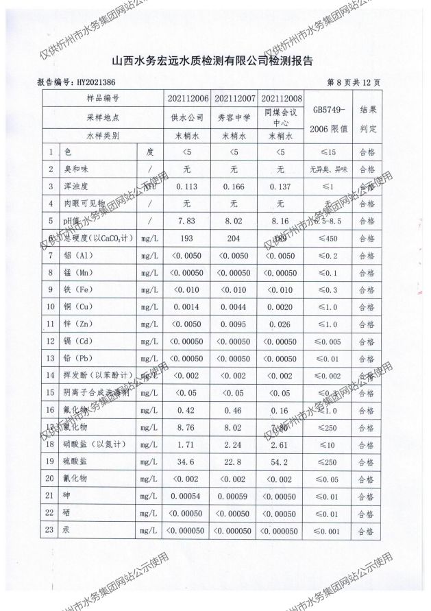 忻州城區(qū)公共供水水源水、出廠(chǎng)水、管網(wǎng)水、管網(wǎng)末梢水2021年12月份水質(zhì)信息公示