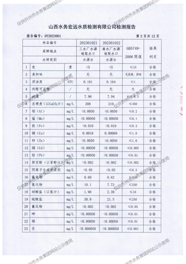 忻州城區(qū)公共供水水源水、出廠水、管網(wǎng)水、管網(wǎng)末梢水2023年1月份水質(zhì)信息公示