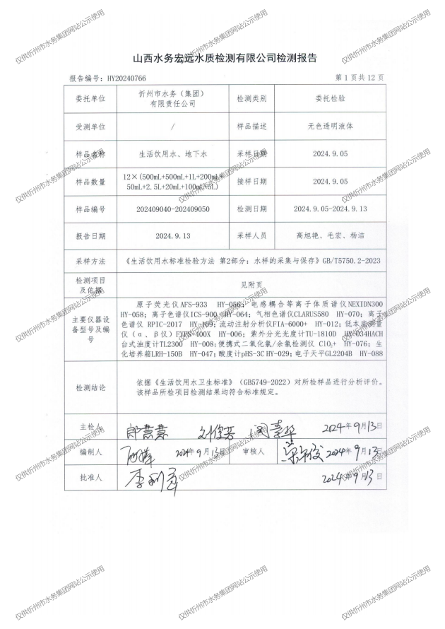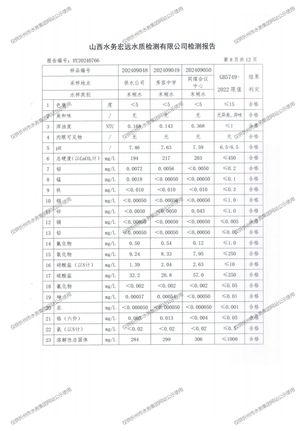 忻州城區(qū)公共供水水源水、出廠水、管網(wǎng)水、管網(wǎng)末梢水2024年9月份水質(zhì)信息公示